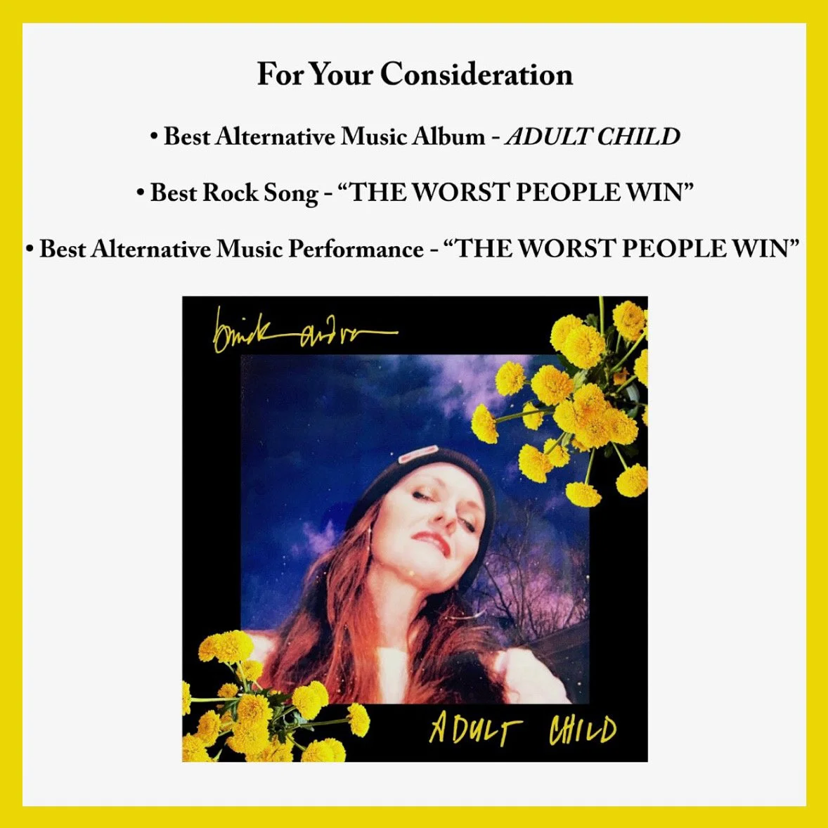 The last time I wrote to you, I mentioned that my album ADULT CHILD and its opening track THE WORST PEOPLE WIN had both been submitted for GRAMMY nomination consideration! We’re currently in the voting season, so if you’re a member of the Recording Academy, my work is eligible! If you’d like further details on the project and track, it’s all available at the FYC page! Thanks in advance for your consideration.
